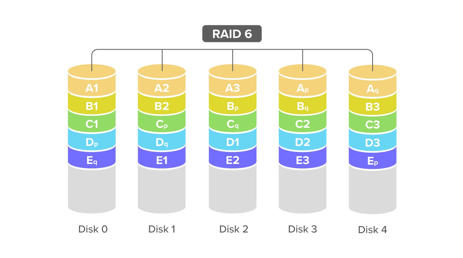 Block-level data is striped evenly over the available disks. Can be recovered from 2 disk failures.