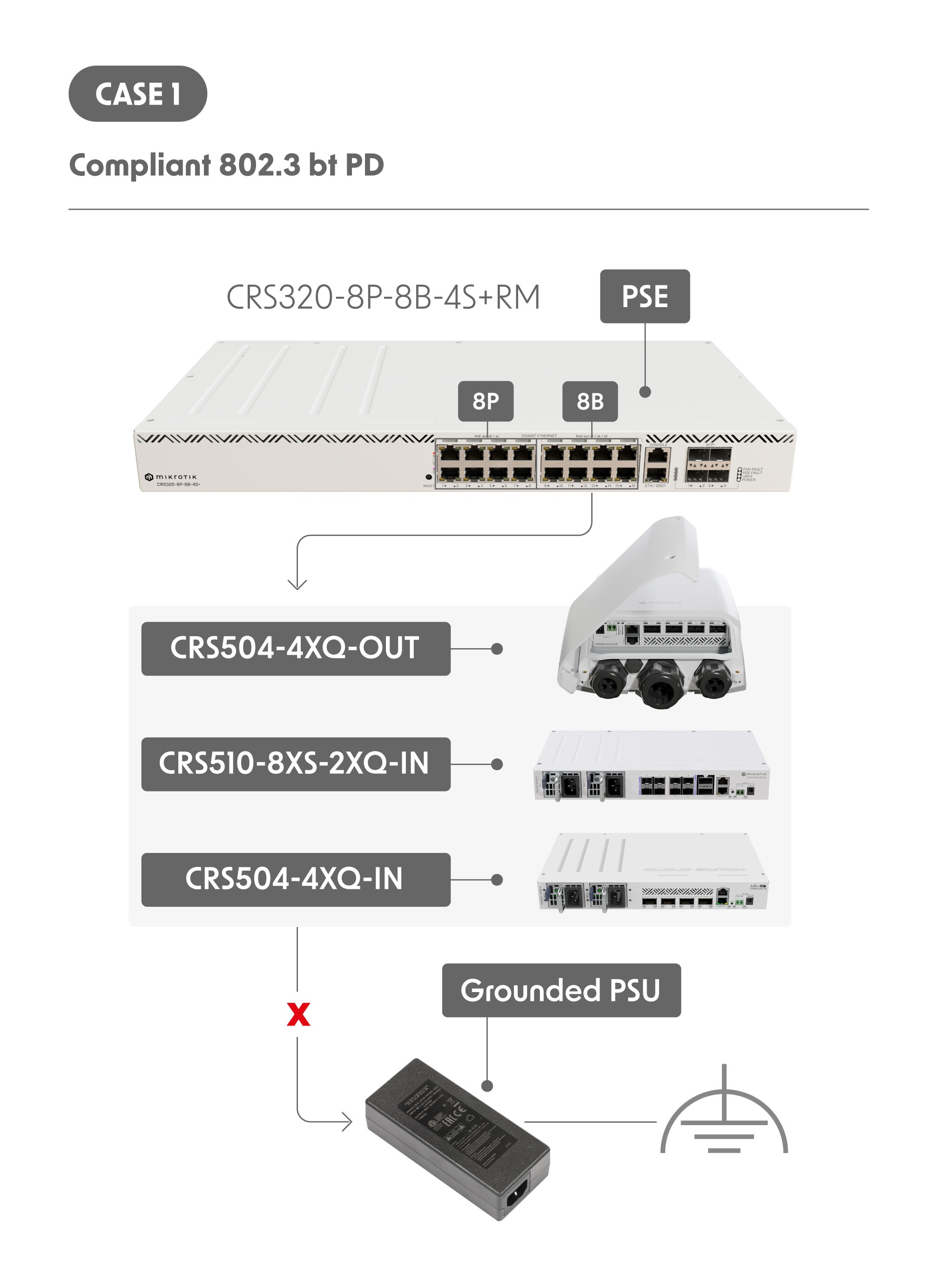 An 802.3 af/at/bt device, such as the CRS504-4XQ-OUT, CRS510-8XS-2XQ-IN, or CRS504-4XQ-IN , can be connected to one of the 8B ports, but it shouldn't be additionally connected with a grounded PSU.