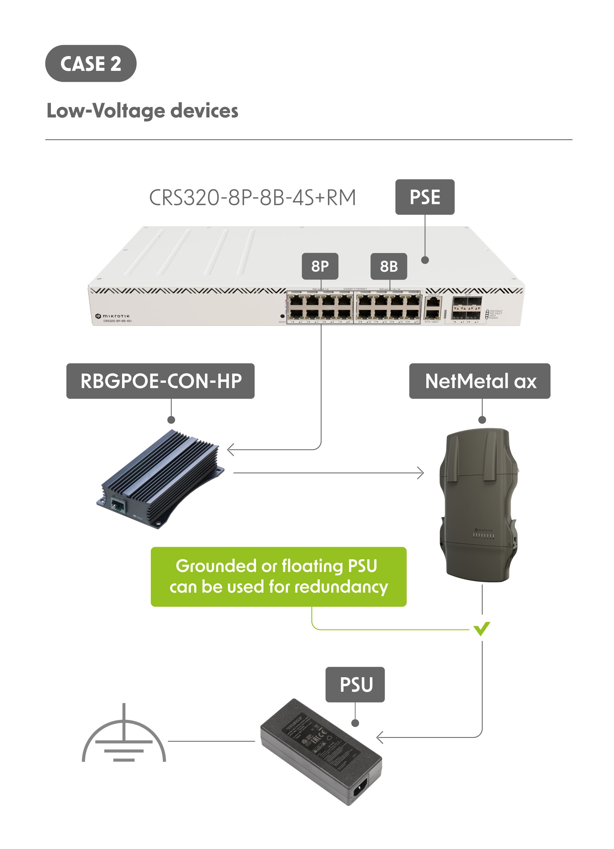 To power a Passive PoE device, the RBGPOE-CON-HP should be used. Grounded or floating PSU can be used for redundancy.