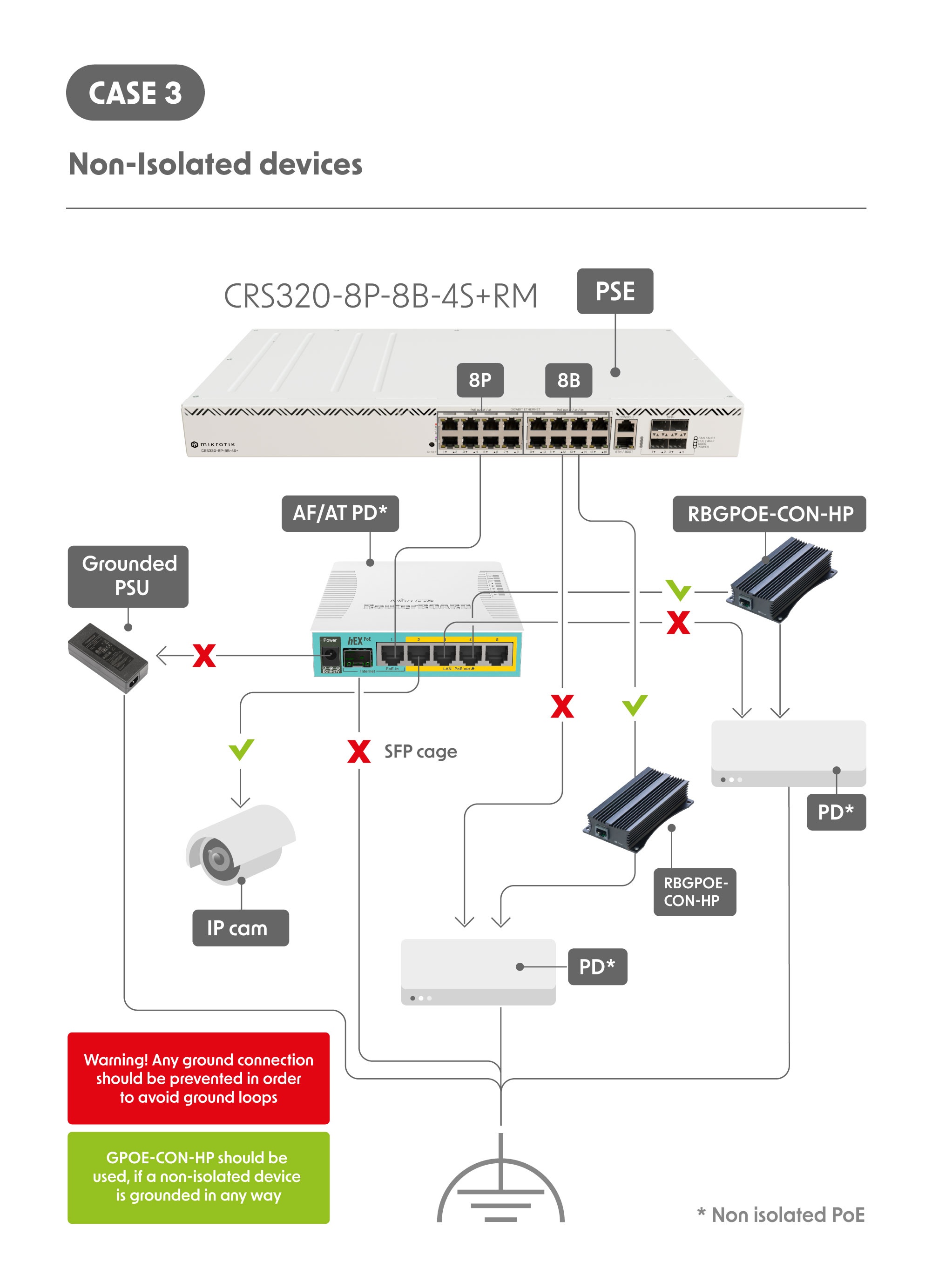 - Grounded PSU can't be used for Powered Devices at the same time.