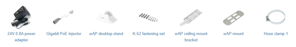The device can be mounted in several ways: wall, ceiling, pole or it can be placed in specially designed MikroTik holder which comes with the package. The package includes a drill hole template with instructions, to help you with the Ethernet cable installation and attachment to a ceiling or a wall. The package also includes a steel bracket to put on the other side of a dropdown ceiling tile and two screws and wall anchors. The Unit can be attached to the pole using zip ties or steel clamp.