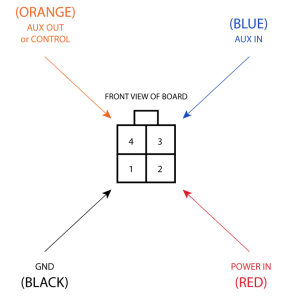 - The automotive connector can be used to power the device from regular 12/24 V ⎓ connections in automobiles and buses. The plug has four pins: bottom left (black) is the ground, bottom right is power in (red). The upper two (AUX) are reserved for future use.